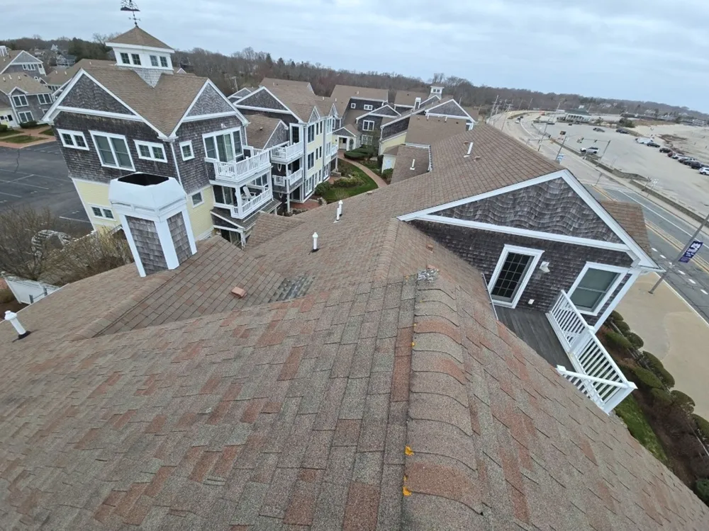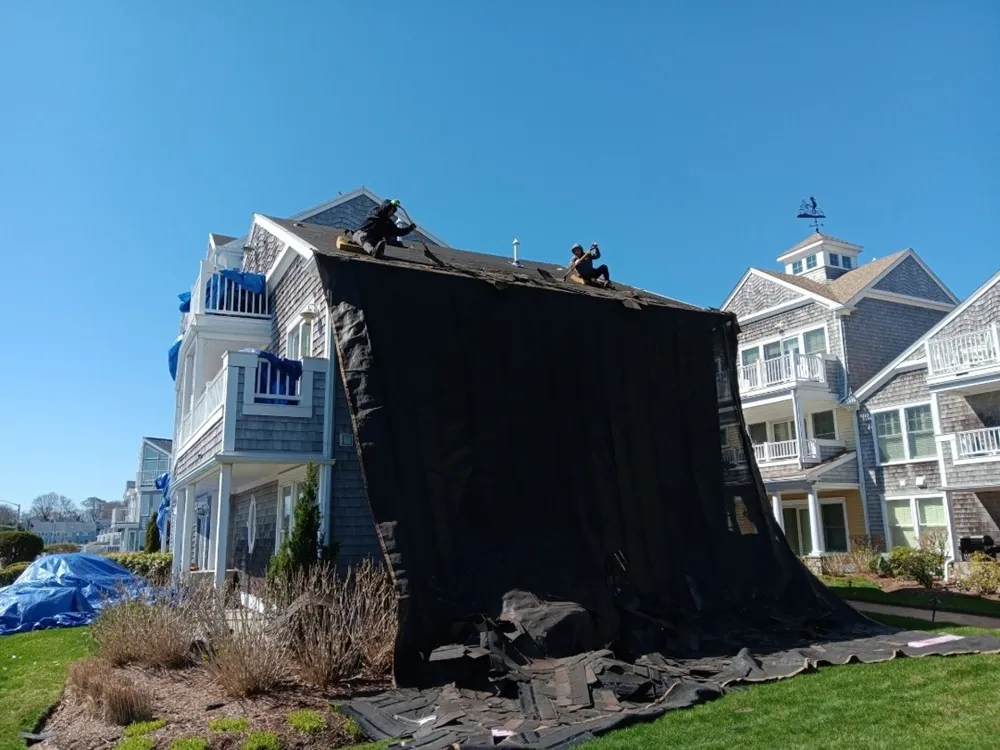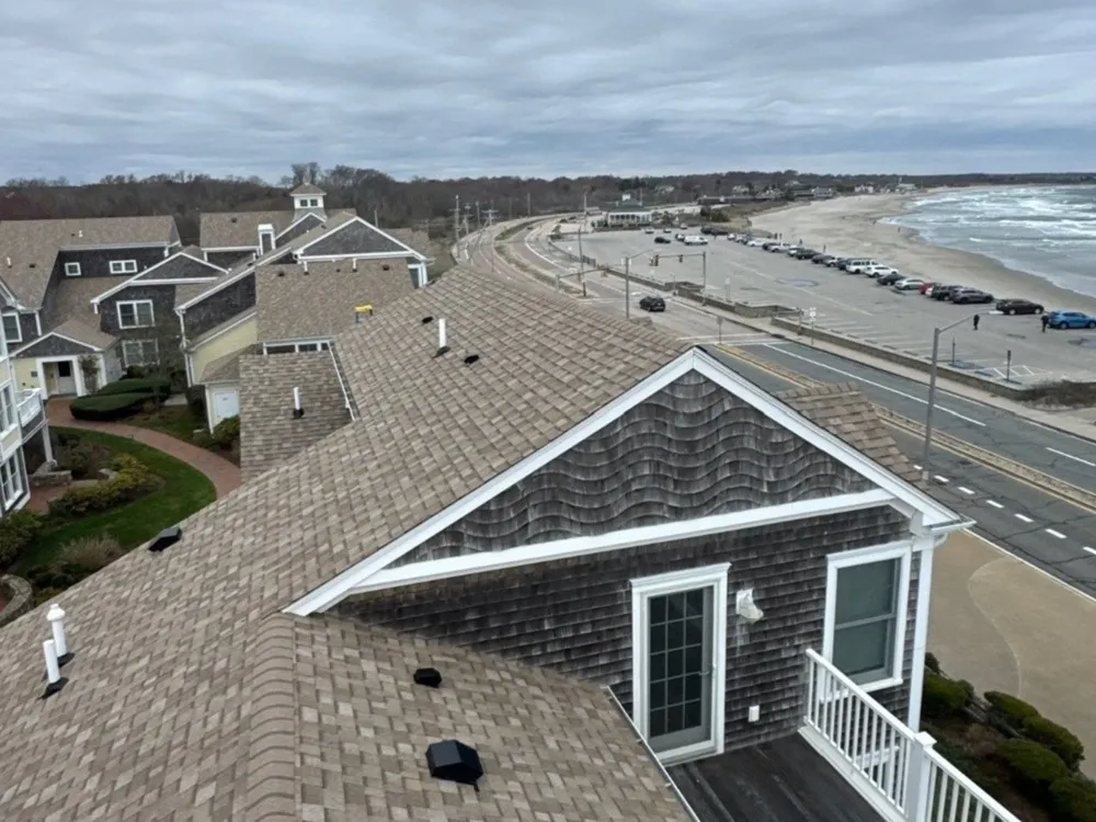 This roofing project in Narragansett, RI involved a complete roof replacement for a multi-level coastal property. The scope of work began with careful removal of the old shingles and underlayment, using protective tarps to safeguard the landscaping and building exterior during the tear-off process. After stripping the roof down to the decking, a new high-performance underlayment system was installed to provide superior moisture protection, especially important in a coastal environment exposed to salt air and strong winds.